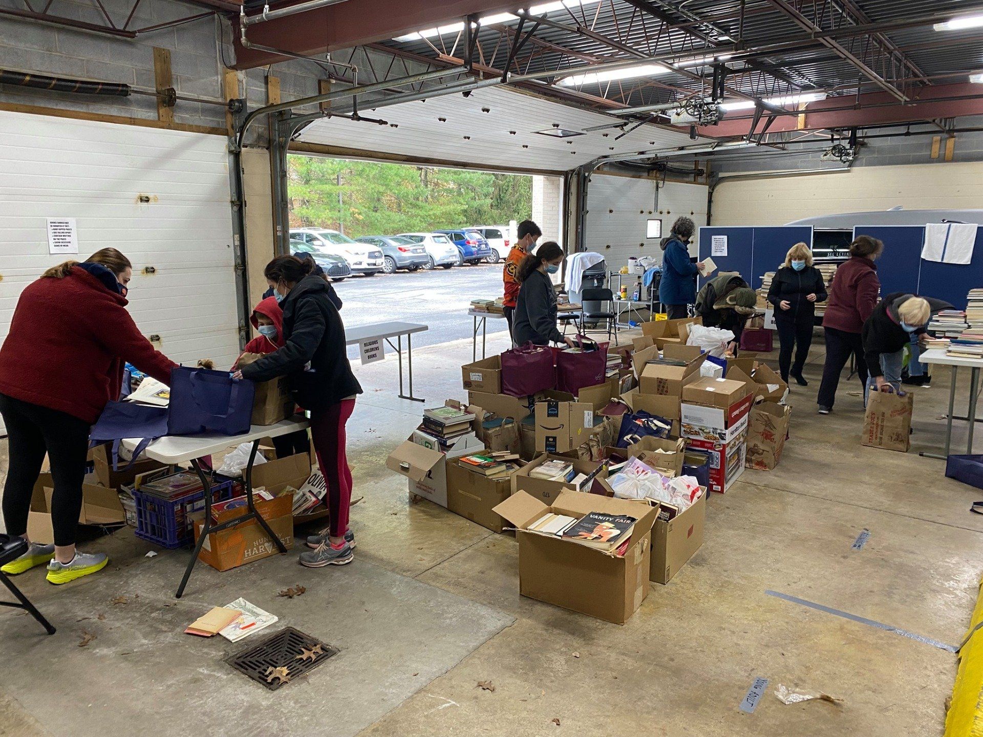 Sol Levinson, JVC and commiunity volunteers sorting hundreds of books from our immensely successful Book Drive.
